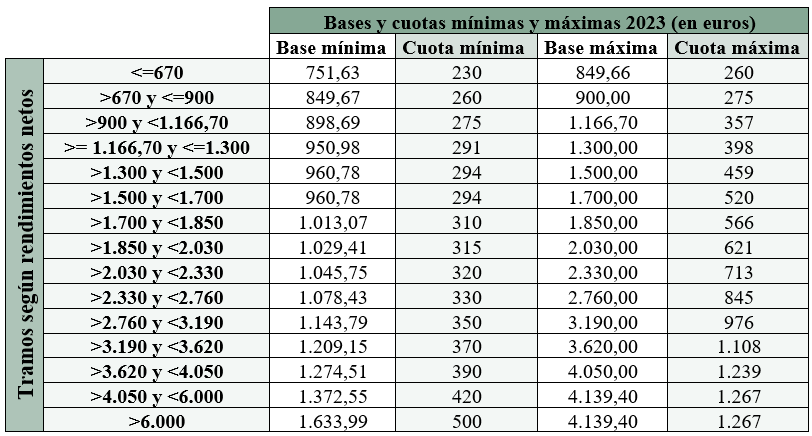Los tramos que entrarán en vigor el 1 de enero de 2023 lo harán con una cuota mínima de 230 € y una máxima de 500 € mensuales. En 2024 la cuota mínima será de 225 € y la máxima de 530 € mensuales y, finalmente, en 2025 el mínimo será de 200 € y el máximo de 590 € mensuales.