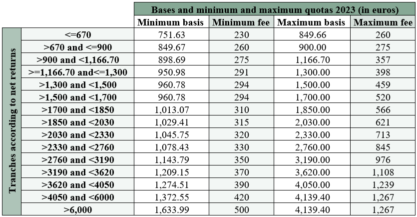 The tranches that will come into force on January 1, 2023 will do so with a minimum fee of €230 and a maximum of €500 per month. In 2024 the minimum fee will be €225 and the maximum will be €530 per month and, finally, in 2025 the minimum will be €200 and the maximum will be €590 per month.